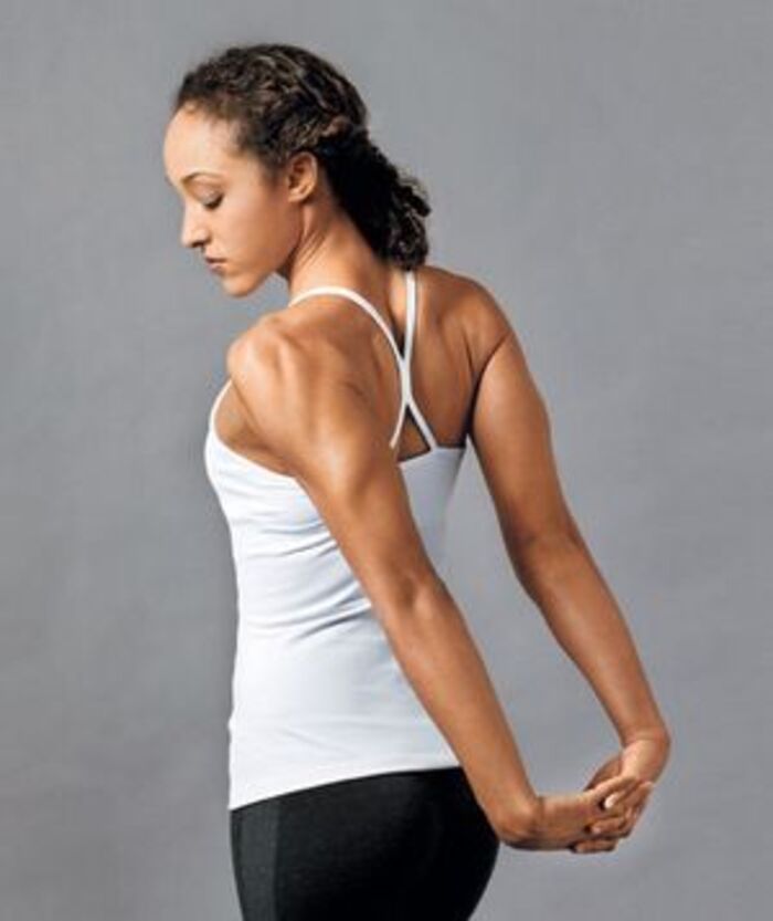 등 뒤로 두 손을 깍지 낀 상태로 아래 방향으로 팔을 늘려줍니다.