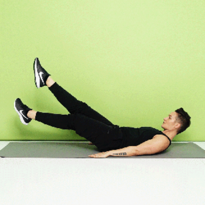 등을 바닥에서 떼지 말고 복부에 힘을 줍니다.